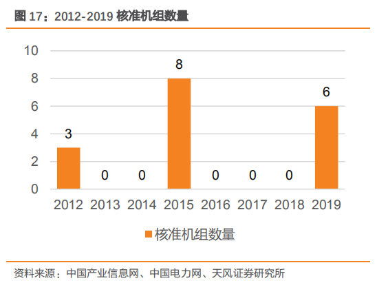 2012年底曾核準2台機組;此後(hòu)直到2015年才再次密集核準8台(包括我國(guó)擁有自主知識産權的華龍一号全球首堆福清5、6号);2016-2018年進(jìn)入三年零審批的冰封期。