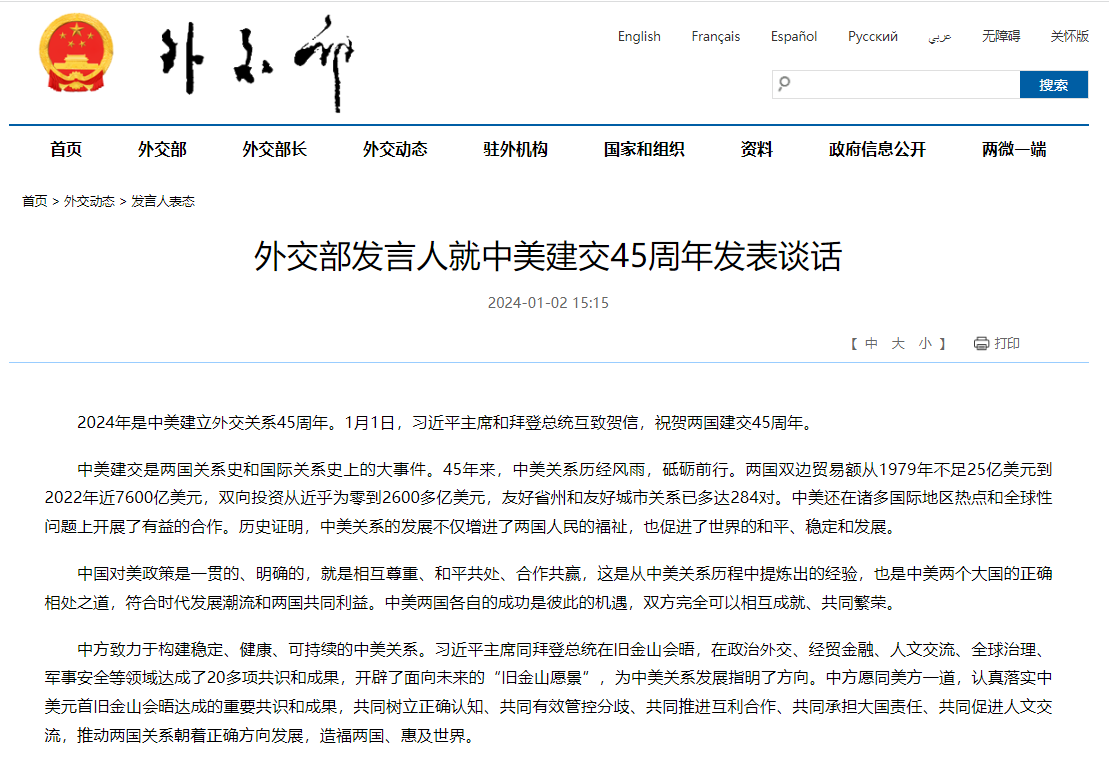 2024年是中美建立外交關系45周年。1月1日,習近平主席和拜登總統互緻賀信,祝賀兩(liǎng)國(guó)建交45周年。
