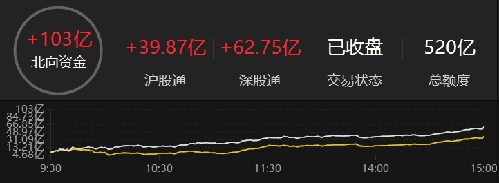 上證報中國(guó)證券網訊 3月11日,北向(xiàng)資金全天淨買入103億元;其中滬股通淨買入39.87億元,深股通淨買入62.75億元。