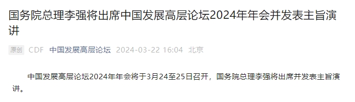 上證報中國(guó)證券網訊 據中國(guó)發(fā)展高層論壇微信公衆号3月22日消息,中國(guó)發(fā)展高層論壇2024年年會(huì)將(jiāng)于3月24至25日召開(kāi),國(guó)務院總理李強將(jiāng)出席并發(fā)表主旨演講。